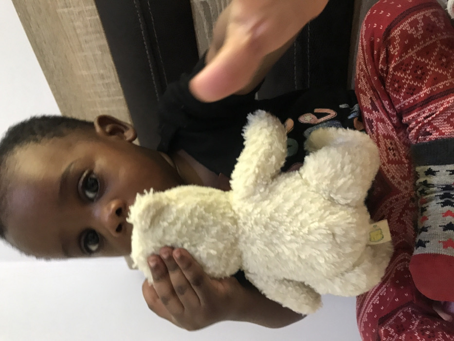 A young child, identified as being in Galadimawa, Nigeria, is seated indoors, facing the viewer. The child possesses dark skin and short, dark hair, with large, dark eyes looking directly forward. Dressed in a black short-sleeved t-shirt, red pants with a white geometric pattern, and gray and red patterned socks, the child holds a cream-colored, plush teddy bear. The teddy bear is positioned centrally, held by both hands partially obscuring the child's mouth and chin. The child's right hand extends forward, slightly blurred, with fingers partially splayed towards the camera. The immediate background consists of a plain light-colored wall on the left and a section of dark, possibly wooden or upholstered, furniture on the right.
