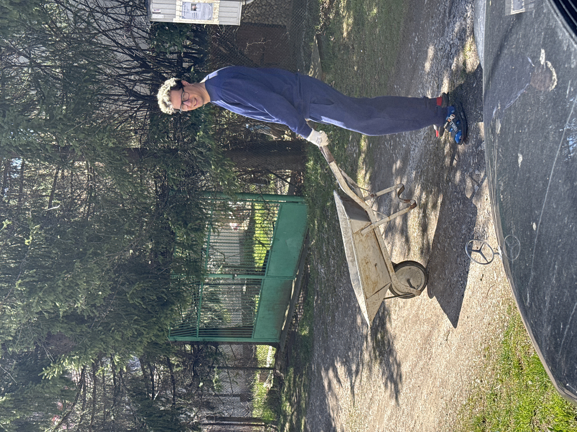 A man in a blue jumpsuit, white gloves, and glasses stands on a gravel path in Galabovtsi, Bulgaria. He holds the handles of a white wheelbarrow. Behind him are a large tree, a green metal gate, and a wire fence. A black car is parked on the right edge of the frame.