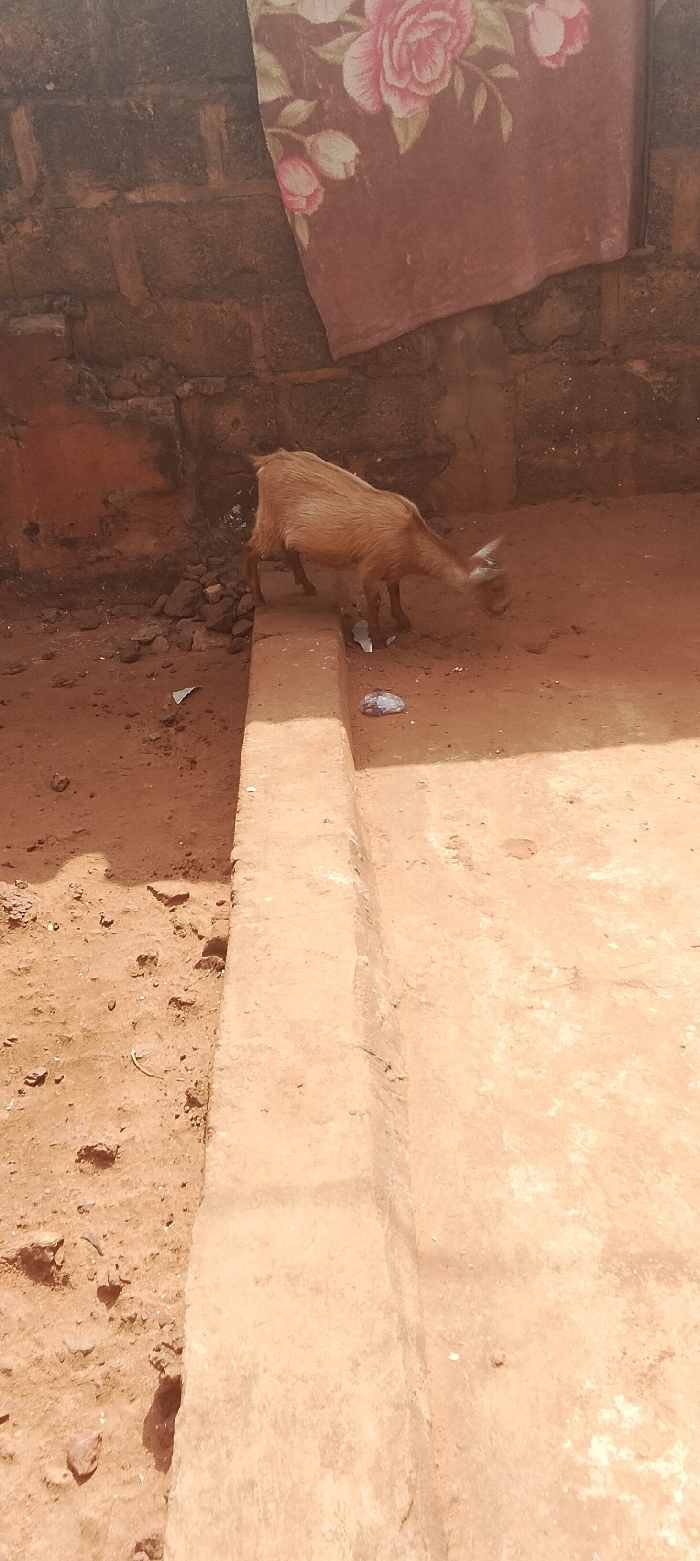 The image depicts an outdoor area in Unknown, Unknown, under strong daylight conditions. A single light brown goat, possessing small horns, is positioned in the mid-ground, with its head lowered towards the reddish-brown earthen surface, appearing to forage among scattered debris. The ground is unpaved, irregular, and comprised of reddish-brown soil mixed with small pebbles and fragments of white and translucent materials, consistent with plastic or paper waste. A horizontal, low-rise structure, appearing to be a concrete or mud-brick ledge of reddish-brown color, traverses the scene at roughly mid-height. Behind this structure, a wall constructed from dark reddish-brown, rough-textured bricks or stones forms the background. A dark reddish-brown fabric, patterned with pink and white roses and green foliage, is draped over the upper right section of this brick wall.