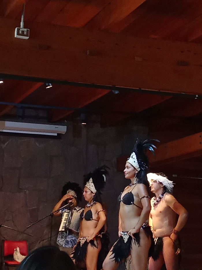 Four people are on stage performing. Three women and one man wear traditional Polynesian outfits, including bikini tops, feather skirts, and feathered headdresses. One of the women has a tall headdress. The man also wears a feather skirt and headdress. Another man plays an accordion wearing a patterned shirt and headdress. A microphone is in front of him. A red chair sits to the left, with a white object on the seat. The background features dark stone walls and exposed wooden beams.