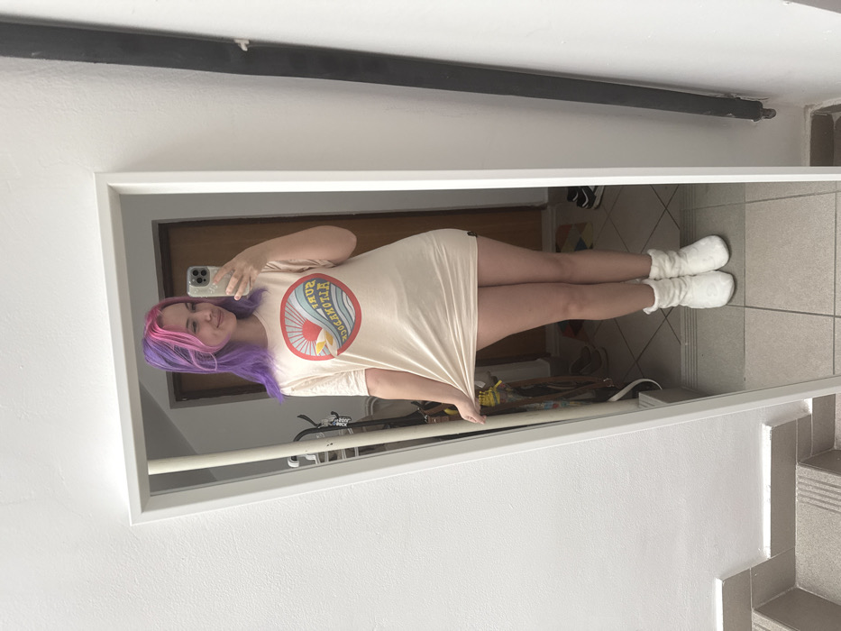 A female individual is visible in a full-length mirror selfie, positioned in an indoor residential or apartment setting within the City of Zagreb, Croatia. She has long hair, dyed purple with distinct pink frontal highlights, and is smiling faintly while holding a light-colored smartphone with a multi-lens camera array in her right hand to capture the reflection. She wears a loose, light beige t-shirt featuring a circular graphic with a red sun, blue waves, and a yellow surfboard, along with text that appears to read 'SURF ALOHA DOCK'. Her left hand is pulling the shirt's lower hem, revealing her bare legs. She is wearing white, fuzzy, ankle-high slippers. The reflected background behind the individual includes a light-colored tiled floor and a dark wooden door. Partially visible on the left side of the reflection is a metallic, vertical structure, possibly part of a clothes rack or bicycle. A pair of dark shoes rests on the floor near the door. Outside the mirror's white frame, a plain white wall and light grey tiled stairs are visible to the left, while a plain white wall with a vertical black pipe is on the right.