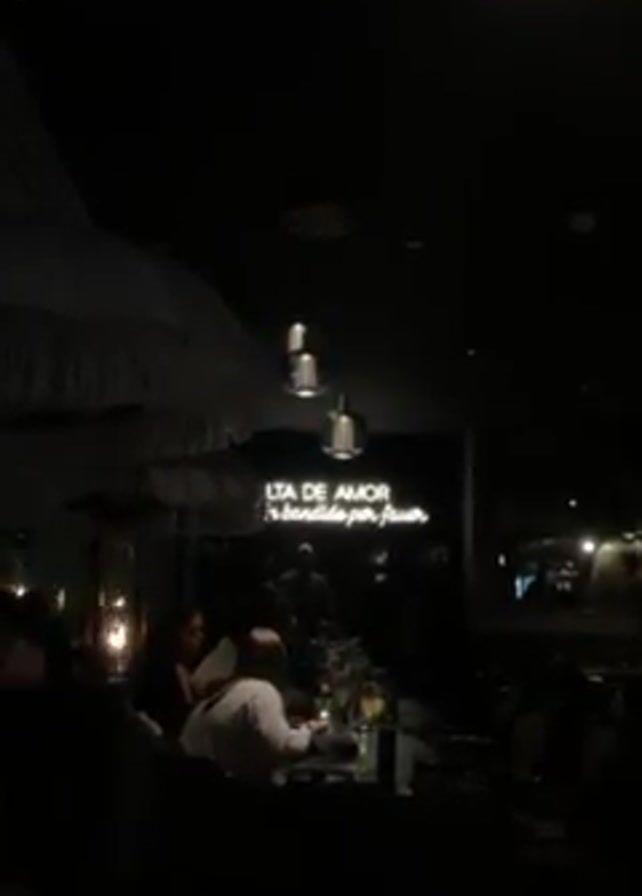 dimly lit restaurant with people sitting at tables. There are white umbrellas hanging from the ceiling, and several pendant lights provide dim illumination over the tables. A neon sign reading "LTA DE AMOR is bandido por favor" can be seen on the back wall. People are seated around tables, likely dining or socializing. The room is dark, making details difficult to discern.