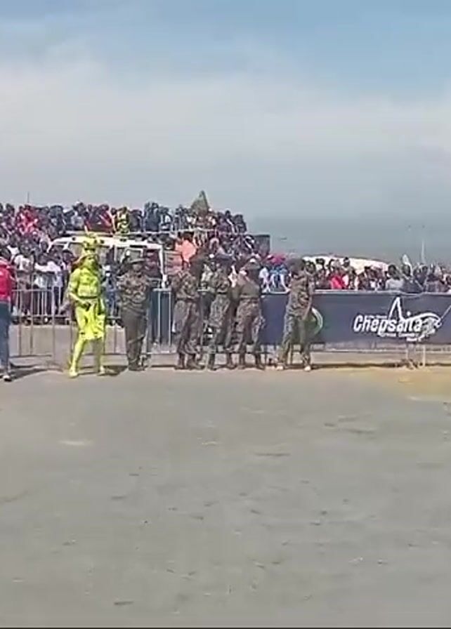 The video captures a wide shot of a large crowd gathered at what appears to be a sporting event, possibly a cross-country race, as suggested by the "Chepsaita Cross Country Run" banner. The crowd is densely packed behind a metal barrier. Several individuals wearing military uniforms are standing along the barrier, maintaining security and order. A person in a bright green full-body suit stands out among the crowd. A man in a red jacket with the word "KENYA" is visible. There's also a man standing on a small stage-like structure with a blue vest. In the background, there's a clear view of a vast landscape under a sky with scattered clouds, indicating an elevated location or hilltop venue.