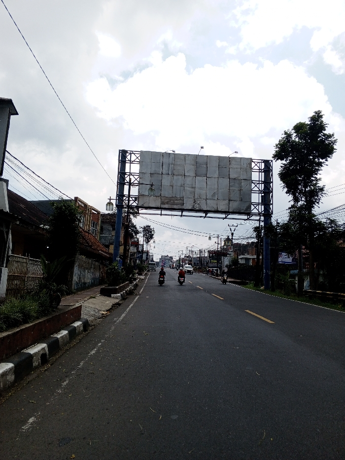 The image displays a multi-lane asphalt road under an overcast sky, stated to be in Multhan, India. A large blue metal gantry structure spans the road in the midground, supporting an empty billboard composed of multiple rectangular, weathered grey panels. Overhead lighting fixtures are attached to the top of this billboard structure. The road features a yellow dashed center line and white solid lines on the shoulders. On the left side, a sidewalk with black and white painted curbs runs alongside low concrete planter boxes containing minimal vegetation. Beyond this are multiple low-rise buildings, some with tiled roofs, consistent with older urban architecture. Numerous utility poles and a dense network of overhead wires are visible on both sides of the road. On the right side of the road, a tall, narrow tree stands next to the asphalt. Further down, additional buildings and utility poles are present. Three motorcycles are observed traveling away from the viewer in the right lane. The leading motorcycle is dark, ridden by an individual in dark clothing. The second motorcycle appears lighter, ridden by an individual wearing a red top. A third motorcycle is further down the road. A white van is visible in the left lane further down the road, and a white car is further ahead in the right lane. The scene is illuminated by diffuse daylight.