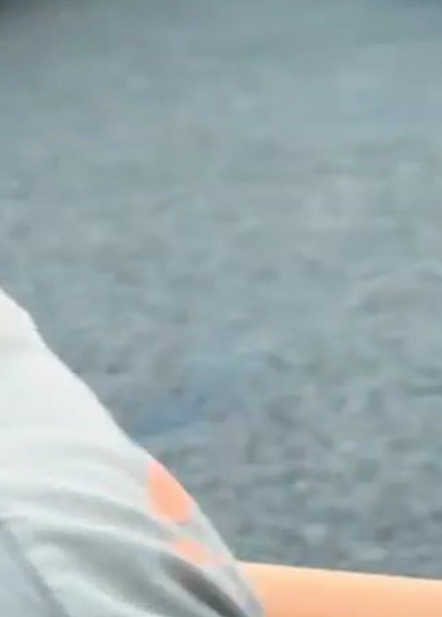 A child looks at the camera. The camera moves, revealing that the child is at a playground. The playground is near water.
