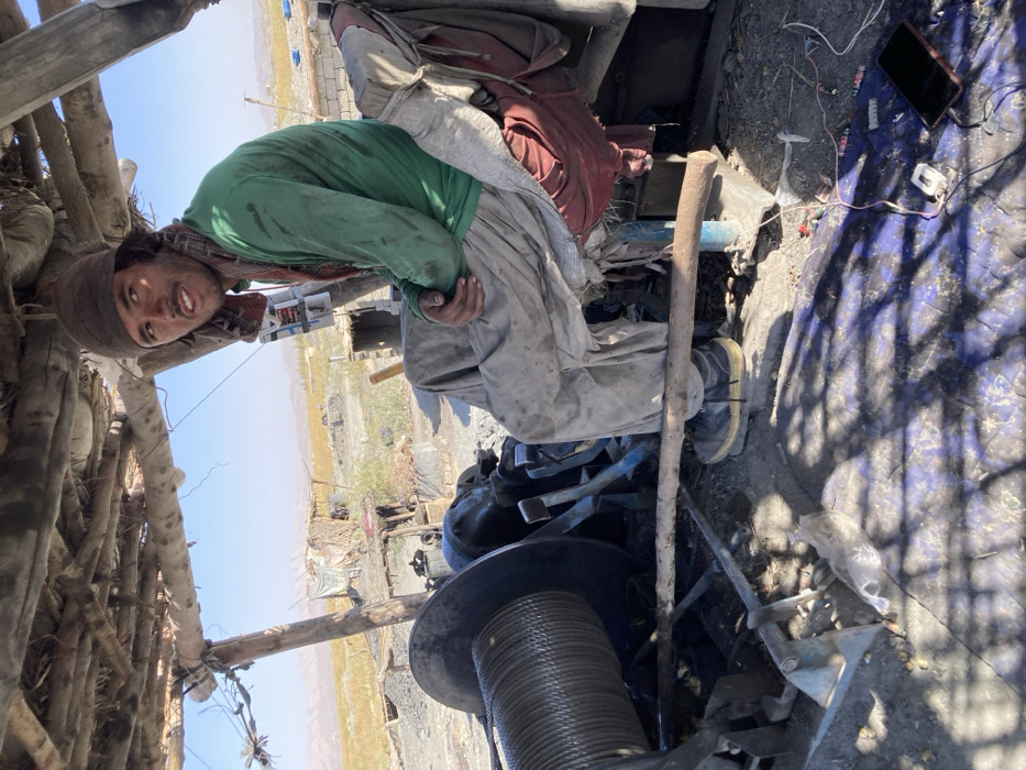 An outdoor scene in Duki, Pakistan, depicts a male individual seated beneath a makeshift canopy constructed from rough wooden poles and dried vegetation. The man, appearing young with facial stubble, wears a dark brown head covering, a soiled green long-sleeved shirt, and light-colored, loose-fitting trousers. A red fabric is visible beneath his right thigh. He is positioned facing the camera, hands clasped, with a slight smile. To his left, a prominent dark metal winch drum wrapped with cable is situated next to other heavy machinery components, some painted blue. The ground beneath the canopy is dry and uneven, with a dark blue tarpaulin in the foreground where a dark smartphone is connected to a white charging unit and cable. In the background, an expansive, arid landscape unfolds under a clear blue sky, featuring piles of dark material, indicative of a mining or industrial site. Several rudimentary shelters or structures are visible amidst the dusty terrain, with distant hills or mountains on the horizon. A pack of cigarettes is secured to a vertical support near the man's head.