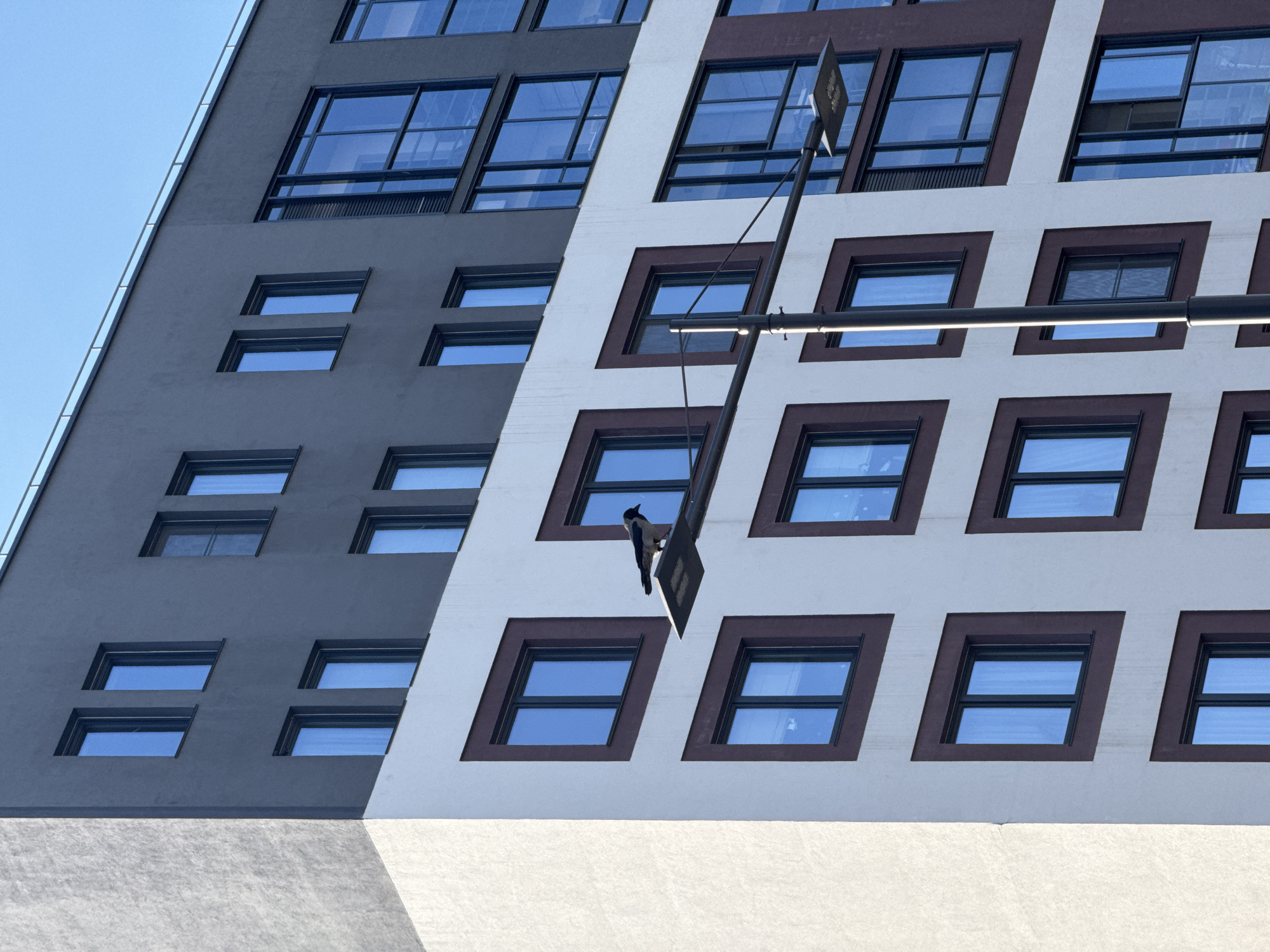 A medium-shot, eye-level, outdoor photograph captures the corner of a modern building in Izhevsk, Russia, juxtaposing gray and white sections. The building is characterized by numerous rectangular windows. The gray portion of the building has dark-framed windows, while the white section is adorned with brown-framed windows. The sky is visible in the upper-left corner, indicating a clear day. A streetlight pole intersects the frame, with a bird perched on the light fixture. The lower portion of the building is visible as a textured, light-colored base.