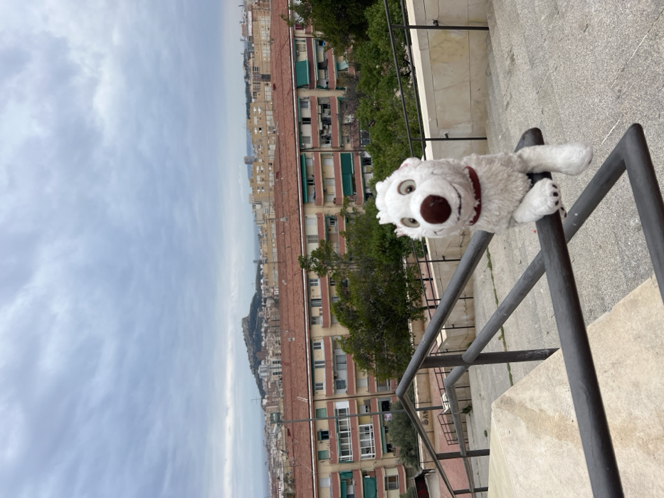 A white plush dog toy with a brown nose and a red collar is positioned on a dark gray metal handrail in the immediate foreground, its front paws draped over the top rail. The handrail borders a descending concrete staircase. In the midground, beyond the stairs, are green trees and a residential area composed of multi-story buildings featuring light-colored facades and red tiled roofs; some balconies display green awnings. The background reveals a panoramic view of the city of Alicante, Spain, under a cloudy, overcast sky. El Castillo de Santa Bárbara is distinctly visible atop a prominent hill on the left horizon, with the Mediterranean Sea faintly discernible further right in the distance. The scene is observed from an elevated outdoor viewpoint within the city.