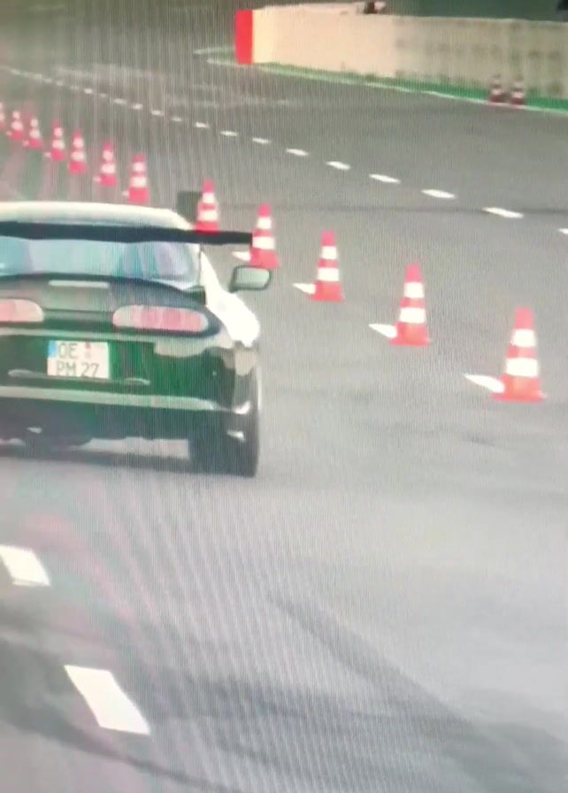 rear view of a dark green Toyota Supra navigating a cone course on an asphalt track. The car has a license plate "DE PM 77". The track is lined with white dashed lines and orange traffic cones are placed to form a winding path. In the background are bleachers with a few people visible, and a green barrier runs along the edge of the track. The car appears to be moving at a moderate speed, kicking up a small amount of dust.