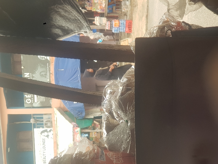 The image presents a daytime urban street scene in Lokoja, Nigeria, viewed from a partially obscured interior perspective. In the immediate foreground, a dark, horizontal surface occupies the lower third, concealing the base of several items. Above this, multiple irregular-shaped objects wrapped in clear plastic are stacked, extending from the left to the right side of the frame. Two dark, vertical, rectangular structures, possibly wooden beams, symmetrically frame the central midground, spanning from the bottom to near the top of the image. In the midground, a paved road or pedestrian walkway is visible. An individual dressed in dark clothing, including a hood, walks from the right towards the left. They are partially obscured by the foreground elements. Above and to the left of this individual, a prominent blue tarpaulin awning is deployed over what appears to be a street-side stall or shop entrance. The background consists of multi-story buildings housing commercial establishments. To the left, a white sign bearing the text "BEAUTY LOUNGE" and a graphic depiction of a woman's face is affixed to a building. To the right of this, another sign reads "GE N HAIR A SHOP," accompanied by a graphic suggestive of a liquid splash or hair design. The building displaying this sign has a blue facade on its upper level. Below these signs, a lighter-colored corrugated metal awning is visible. Further to the far right, adjacent to the street, stacked plastic crates containing various bottled beverages are arranged, indicative of a vendor's setup. The scene depicts a typical commercial thoroughfare in the city.