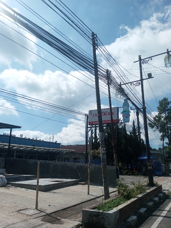 The image depicts a bright, daytime street scene in the city of Naung Bo Oe, Myanmar, under a blue sky with scattered white clouds. Multiple utility poles carrying dense clusters of black overhead wires dominate the upper and central portions of the frame. To the right, two decorative street lamp posts with ornate metalwork are visible, also supporting wires and one featuring a large, blue, bottle-shaped advertisement for "Air Minum Segar Pandaan." In the mid-ground, a prominent white rectangular sign with red text displays "Rumah Makan JANGKAR" and "NASI AYAM." To the left of this sign, a building with a corrugated metal roof and a partially visible sign reading "BESTAURAN GANGKAR" suggests another restaurant or commercial establishment. Behind these structures, additional buildings with reddish-brown roofs and a dense cluster of green trees are visible. The foreground consists of a concrete or paved ground surface. On the right, a concrete planter box containing green vegetation borders the pavement. Towards the center-left, a flat, square concrete slab, possibly a foundation, stands on the ground, flanked by two slender wooden poles. A pile of white sacks is visible near the left edge of the frame. No people or active movements are present in the scene.