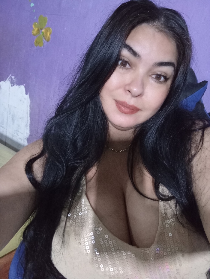 This image displays a single adult female in a close-up, head-and-upper-torso shot, in the city of Unknown, Unknown. The subject has long, dark, wavy hair extending over her shoulders and chest. She has dark eyebrows, brown eyes, and wears a brownish-pink lip color. A thin, gold-toned chain necklace is visible around her neck. She is wearing a light-colored, possibly beige or champagne, low-cut V-neck top adorned with numerous reflective sequins. The background consists of a wall painted a textured, muted purple. On the upper left portion of the wall, a gold-colored, three-leaf clover shaped embellishment is present. Below this, an irregular patch of white paint or primer is visible on the purple surface. A dark blue upholstered object, consistent with a chair, is partially visible on the right side of the frame, behind the subject. The individual is looking directly at the camera.
