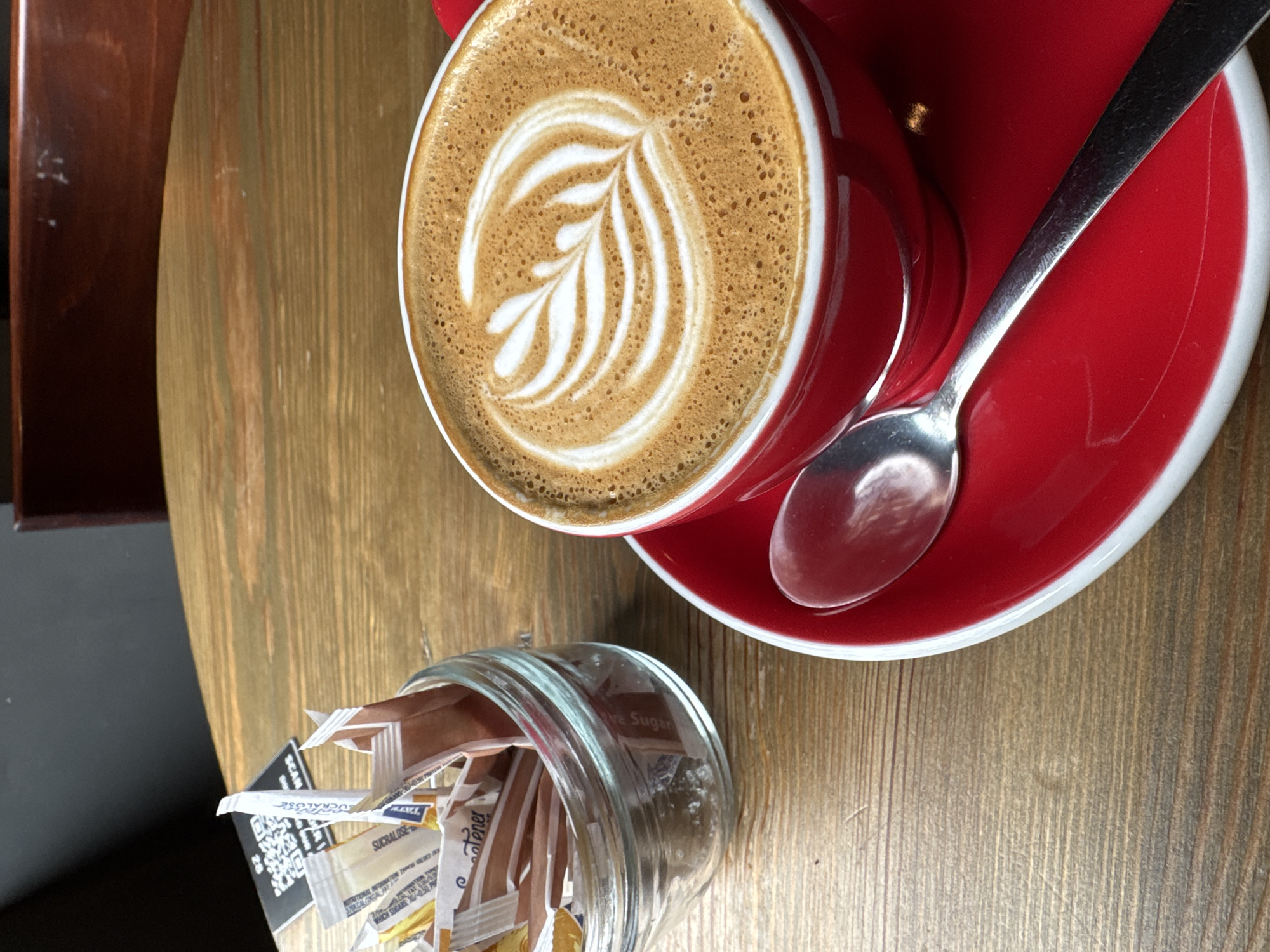 The image depicts an indoor scene within a cafe environment in Chester, United Kingdom. In the foreground, a red ceramic coffee cup with a matching saucer holds a latte featuring a distinct white fern or leaf pattern in its foam. A silver spoon rests on the right side of the saucer. To the left of the cup, a clear glass jar contains an assortment of individual sugar and sweetener packets, including varieties labeled 'Sucralose,' 'Sweetener,' and 'Sugarcane.' All items are positioned on a light brown wooden table exhibiting grain patterns and minor wear. In the upper left corner, a partially visible, inverted black card with a QR code and the word 'SCAN' is present. The background consists of a dark grey wall, with a segment of a reddish-brown wooden chair visible on the far right. No individuals or active interactions are depicted.