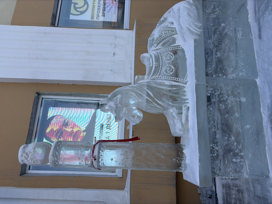 An ice sculpture of a horse head wearing a decorative bridle and saddle is prominently displayed against a building. The sculpture is clear, with textured details indicating the horse's mane and facial features. Below the horse's head, a cylindrical ice block with a red ribbon is attached. A window in the background shows a colorful display with text, while a white sign is visible in the window above. The building's facade is a mix of beige and white, with architectural details adding depth.