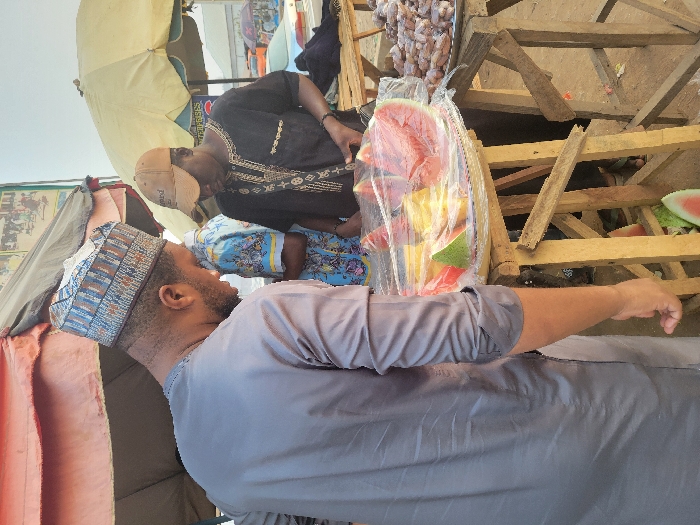 The scene depicts an outdoor market in Kwamba, Nigeria. In the foreground, a male subject wearing a grey long-sleeved tunic and a multi-patterned cap (kufi) stands with his back partially to the camera, looking downward. To his right, a second male subject, wearing a black embroidered shirt and a brown baseball cap, also looks downward towards a market stall. Between the two individuals is a rustic wooden stall. On the stall, a clear plastic-wrapped platter holds various cut fruits, prominently featuring red watermelon slices and yellow fruit (possibly pineapple or mango). To the right of this, on a silver tray, are numerous small, irregularly shaped brown items, consistent with fried snacks or pastries. Additional pieces of watermelon are visible on the ground beneath the stall. Overhead, a red canopy shades the left side of the frame, while a light-colored (possibly yellow or beige) market umbrella is visible on the right. The background reveals other market elements, including a partial billboard with "ENTERPRISES" and a Pepsi logo, a light-colored vehicle, and indistinct figures, all under an overcast sky. The ground surface is composed of dirt.