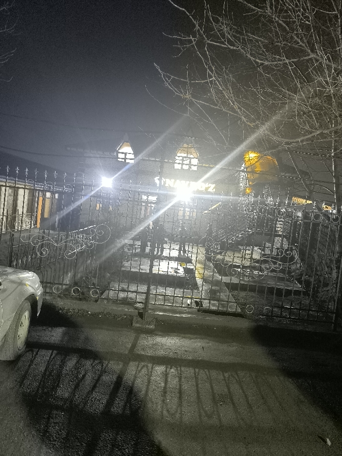 An image shows a building at night behind an ornate black iron fence. The building has a sign that reads "NARDOZ". There are three windows near the top, one central and two flanking it. A yellow object is on the right side of the building. A car is parked on the left side of the fence. The ground is wet and the street is dark with harsh shadows cast by the fence. Bare tree branches are visible on the upper right.