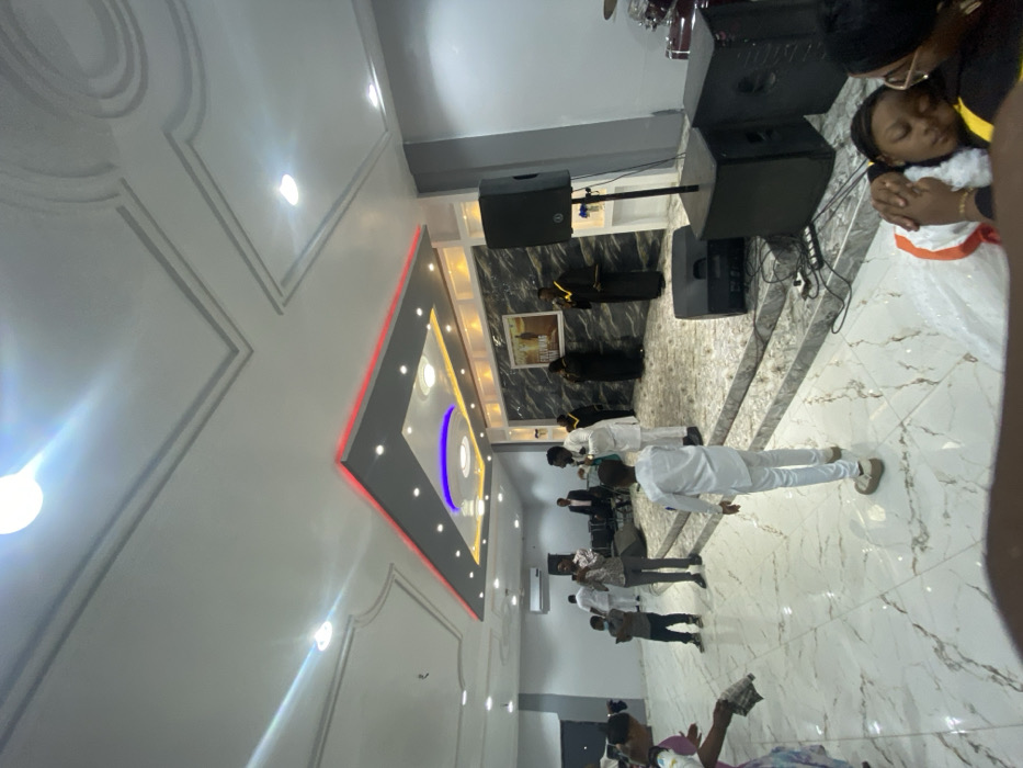 This image depicts an indoor gathering within a modern event space or hall in Gbawe, Ghana