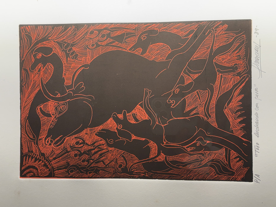 The image is a linocut print, predominantly black figures on a vibrant red-orange etched background. It depicts a chaotic scene titled "Toro luchando con perros" (Bull fighting with dogs), signed "Amorcery" and dated '89, with "P/A" indicating an artist's proof. This artwork evokes the traditional cultural practice of bullfighting, relevant to cities like Ronda, Spain, known for its bullfighting heritage. In the center, a large, dark-silhouetted bull is positioned, facing upwards and left, appearing distressed or in mid-action with a stylized eye visible. Surrounding the bull are at least six smaller, dark-silhouetted dogs in dynamic poses of barking, running, and lunging. A small, stylized bird-like figure with wings is perched on the bull's upper back near its neck. In the background, on both the left and right sides, numerous slender, stylized human figures are rendered in dark silhouette against the red-orange etched lines. Many of these figures have raised arms, suggesting movement, participation, or observation. The entire background is filled with dense, radiating red-orange lines and patterns, creating an energetic and intense atmosphere, including a prominent sun-like or starburst motif in the upper left corner. The composition relies on stark contrast between the solid black forms and the intricate red-orange linework.