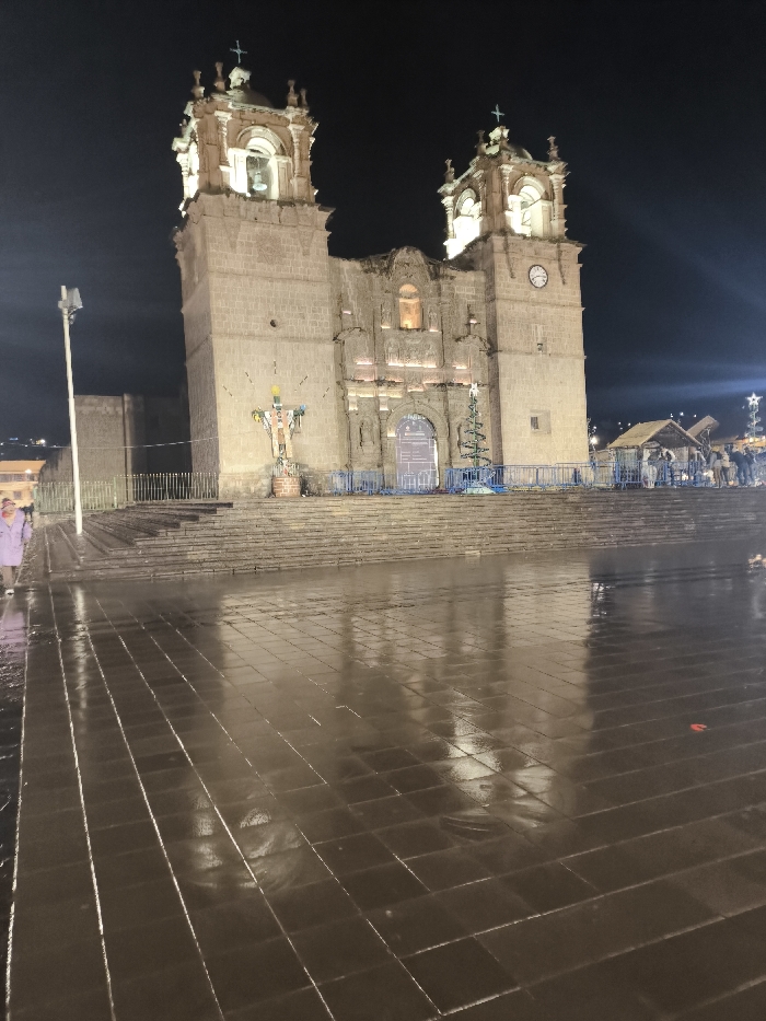 An old stone church dominates the scene at night. Two towers flank a central structure with lit windows and a cross on the façade. A small Christmas tree stands nearby. Steps lead up to the church, and a wet, reflective plaza stretches out in front, suggesting recent rain. Figures are visible near temporary structures in the background, likely a market. A lamppost stands to the left.