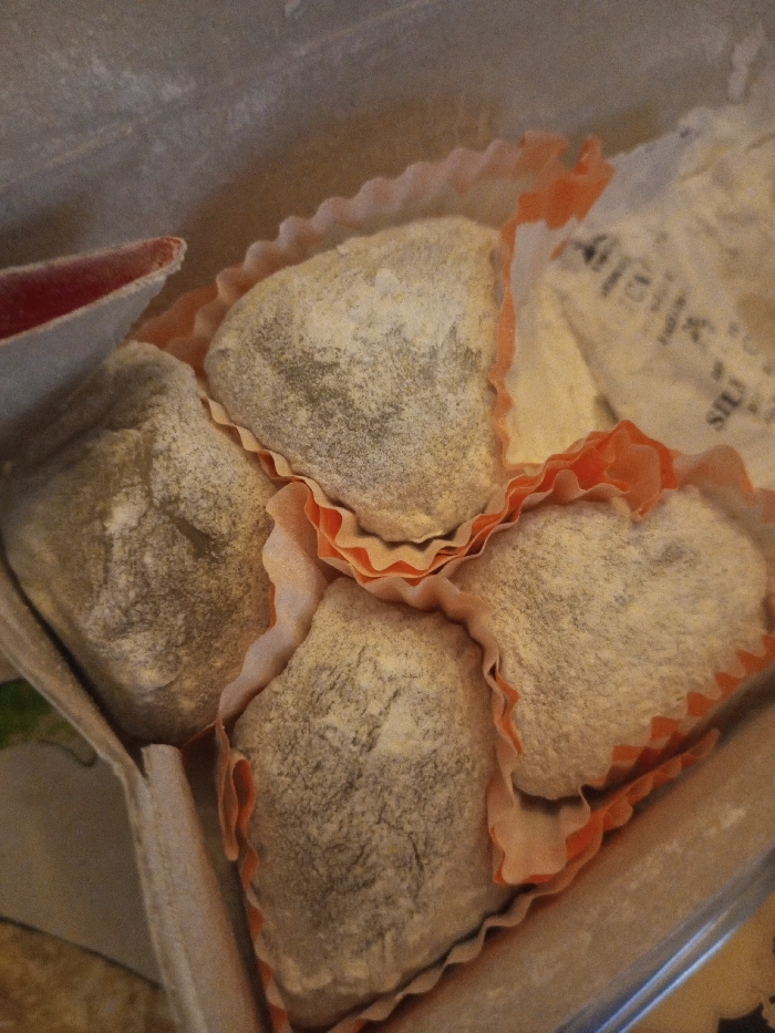 - "The image displays five powdered confections, resembling mochi, contained within a light brown cardboard box, located in Naas, Ireland" by FM-3YrlQ2, licensed under CC BY 4.0