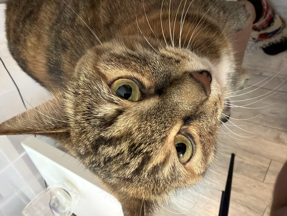 - "This image, documented in Chaikovsky, Russia, depicts a domestic short-haired cat with a tortoiseshell and tabby coat pattern, featuring brown, black, and orange-tan stripes and patches, along with a white patch on its chin and chest" by FM-82K7o1, licensed under CC BY 4.0