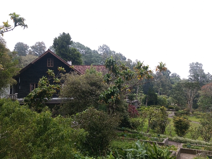 A two-story, dark-wood house with a red tile roof is nestled amidst lush greenery. The house has several windows visible, and a chimney rises from the roof. Surrounding the building are various trees and shrubs, creating a secluded and overgrown feel. In the foreground, there are garden beds and a walkway, suggesting a cultivated area within the natural setting. The sky is overcast.