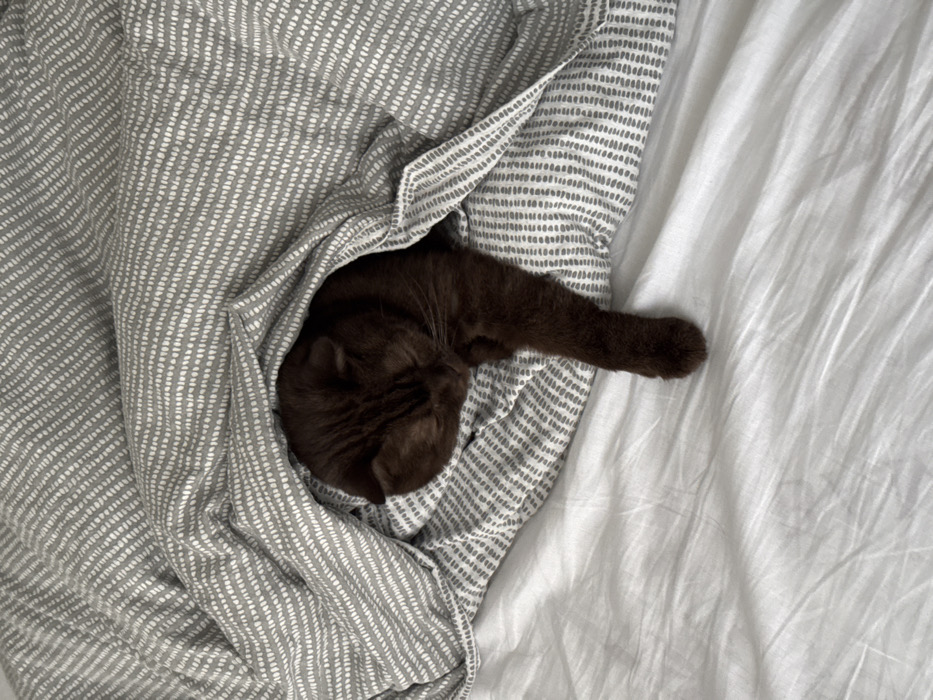 A dark brown cat is observed sleeping or resting on a bed in Tbilisi, Georgia. The cat's head and body are tucked under a grey and white patterned duvet, which features small, irregular horizontal dash marks. One dark brown front paw extends out from under the duvet onto the white bed sheet below. The visible environment consists solely of the bed linens.
