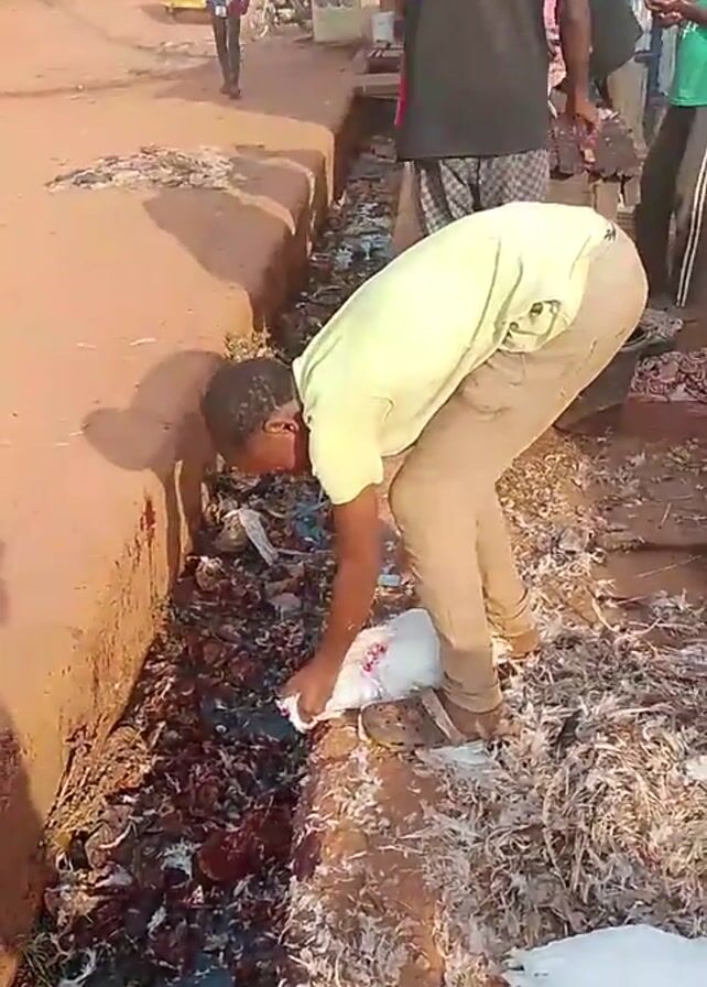 young person in a light yellow shirt and tan pants leaning into a concrete ditch containing a mix of dark liquid, feathers, and other debris. The person is holding a white bird, possibly a duck or chicken, in their hands. Several other people are standing nearby, watching. The scene is outdoors on a street in what appears to be a market or commercial area. There are buildings, other pedestrians, and a yellow vehicle visible in the background. The ground is mostly dirt. The focus is on the young person and the bird in the ditch.