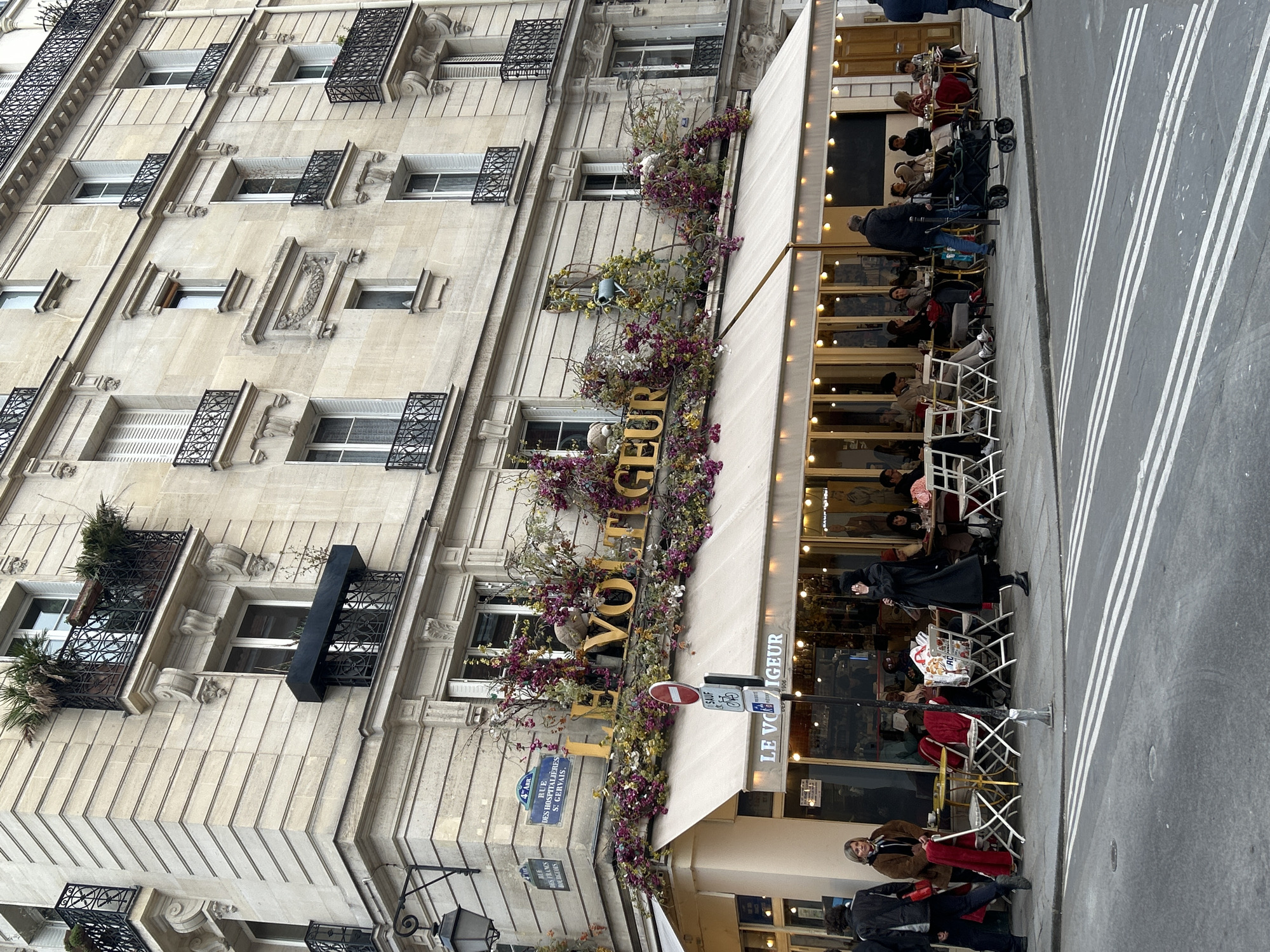 This image depicts a street scene at the intersection of Rue des Hospitalières Saint-Gervais and Rue des Francs Bourgeois in the 4th Arrondissement of Paris, France. The central feature is a multi-story, light-colored stone building of typical Parisian Haussmannian architecture, under an overcast sky. The upper floors feature multiple windows with black wrought-iron balconies and some planters containing vegetation. The ground floor is occupied by "LE VOLTIGEUR" café, identified by large gold lettering above a cream-colored retractable awning. The café's facade above the awning is extensively adorned with artificial or dried floral and leafy arrangements in shades of purple, green, and yellow, featuring a decorative light blue watering can. The awning also displays "LE VOLTIGEUR" and "DEP. 1906." Beneath the awning, an outdoor seating area is furnished with approximately fifteen small white tables and numerous white folding chairs. Roughly 15 to 20 individuals are seated, engaging in dining, drinking, and conversing. Red blankets are draped over several chairs. A white shopping bag, bearing the "Carrefour" logo, is visible on one chair. On the sidewalk, a woman with blonde hair in a brown jacket stands near a table. To her left, an individual in a dark jacket walks away from the camera. Further right, a person in a long black coat and hood walks away, raising a hand to their face. An individual is pushing a dark four-wheeled wagon or stroller from right to left. The asphalt roadway in the foreground features three parallel white painted lines. A black lamp post is positioned on the street corner. A pole on the sidewalk displays a circular red "no entry" sign with a white bar, beneath which is a white rectangular sign indicating "sauf vélo" (except bicycle).