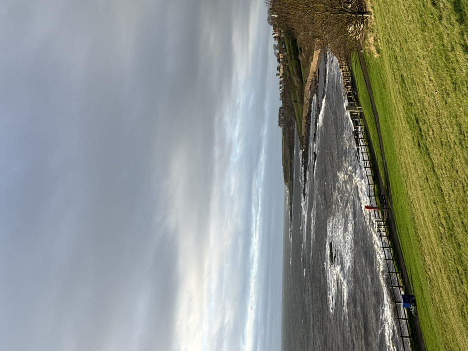 The image displays a coastal panorama in Crail, United Kingdom, viewed from an elevated grassy slope on an overcast day. The sky occupies the upper half, presenting a broad expanse of grey, layered stratocumulus clouds with lighter, brighter areas near the horizon suggesting diffuse sunlight breaking through. Below the horizon, the North Sea stretches across the mid-ground, exhibiting dark, choppy waters with numerous white-crested waves crashing against the rocky shoreline. Several dark rock formations are visible within the nearshore waters. In the foreground, a vibrant green, neatly maintained grassy slope dominates the lower right, descending towards a dark, paved pedestrian path. This path runs horizontally across the scene, bordered by a low, dark wooden post-and-rail fence that separates it from the immediate coastal edge. A dark-colored public park bench faces the sea from beside the path. Immediately to the left of the bench, a prominent red lifebuoy is mounted on a white pole. Further left along the path, two dark blue public waste bins are positioned near the fence, with a dark-colored bicycle leaning against the fence beside them. The coastline extends from the mid-left into the far distance, characterized by rugged, rocky beaches and coves. The land beyond the immediate shoreline rises into a series of green grassy cliffs and undulations. A cluster of buildings, including several residential structures and a larger, multi-gabled, light-colored stone building (possibly a historic manor or castle ruin), is visible atop a distant headland. Bare deciduous trees, devoid of leaves, are scattered along the distant landmass, with a more substantial bare tree partially visible on the far right of the foreground slope. No people are present in the scene.