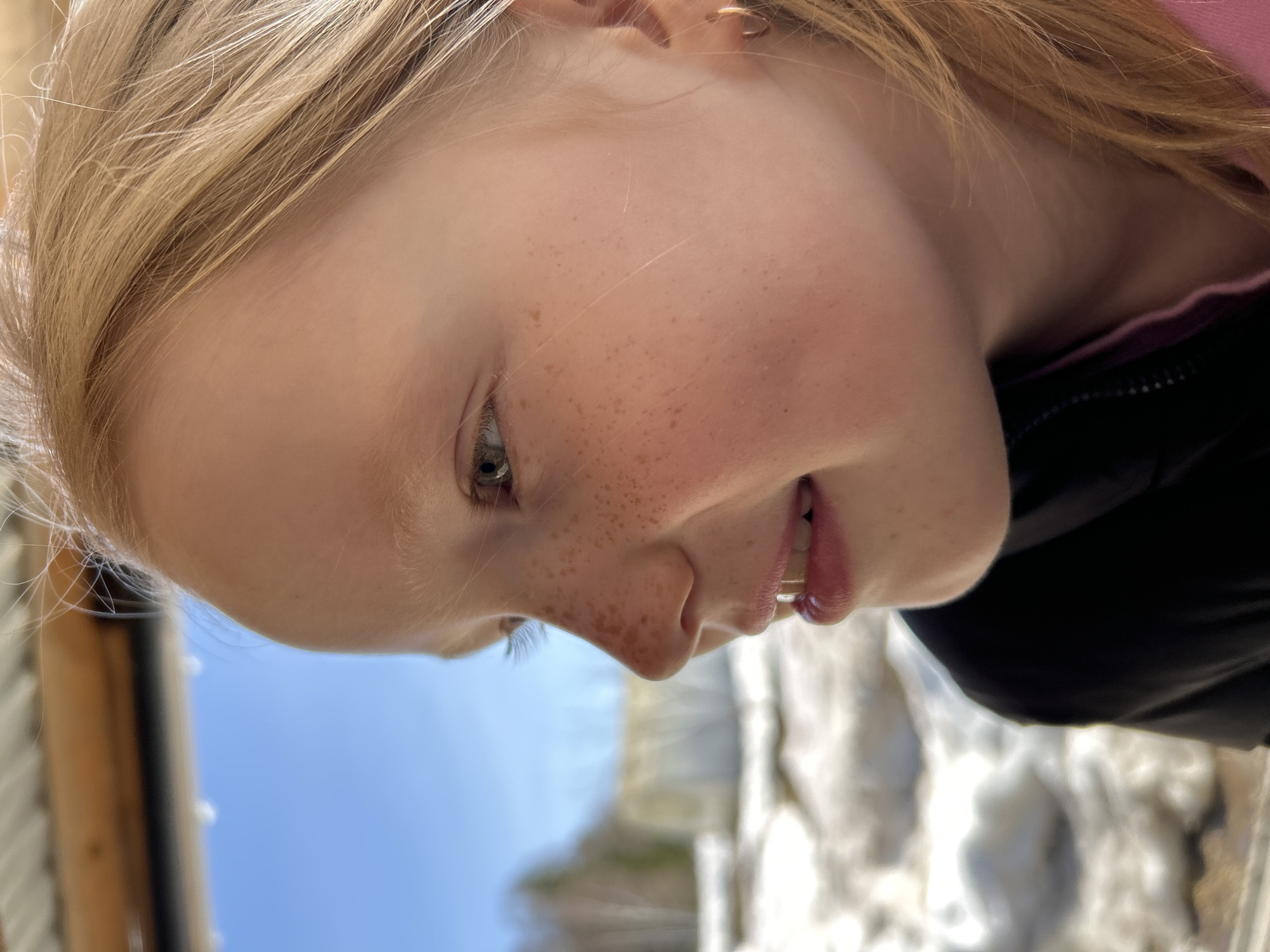 A close-up, tilted shot features a young girl with fair skin and light blonde hair. She has numerous freckles across her face, particularly on her nose and cheeks. Her eyes are light-colored, and her lips are slightly parted. She appears to be wearing a black jacket with a hint of pink clothing visible at the neckline. The background shows a blue sky and a blurred structure, possibly a building or fence, constructed from corrugated metal. The scene is outdoors, likely in a sunny location. Based on the prompt, this image may be taken in Уральское, Russia.