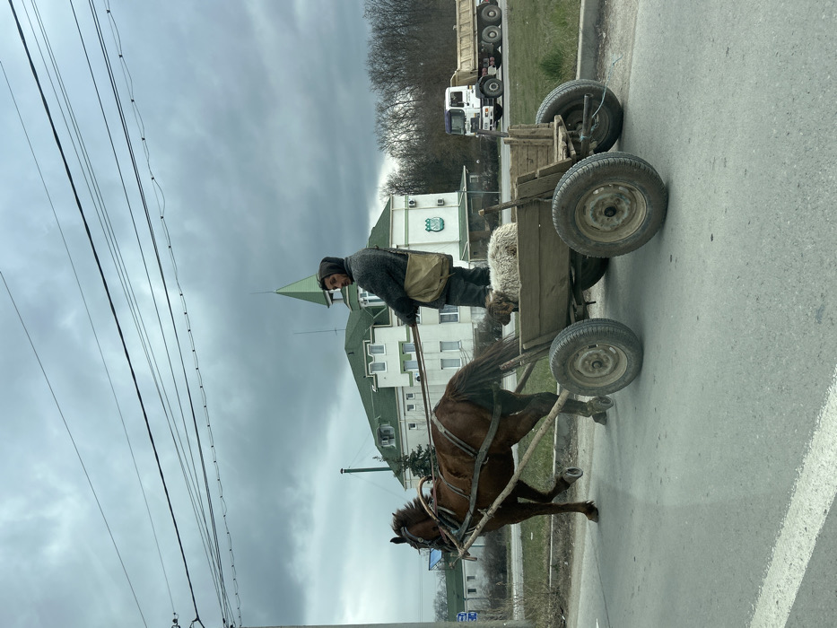 The image captures a horse-drawn cart on a paved road in Omurtag, Bulgaria, under an overcast sky