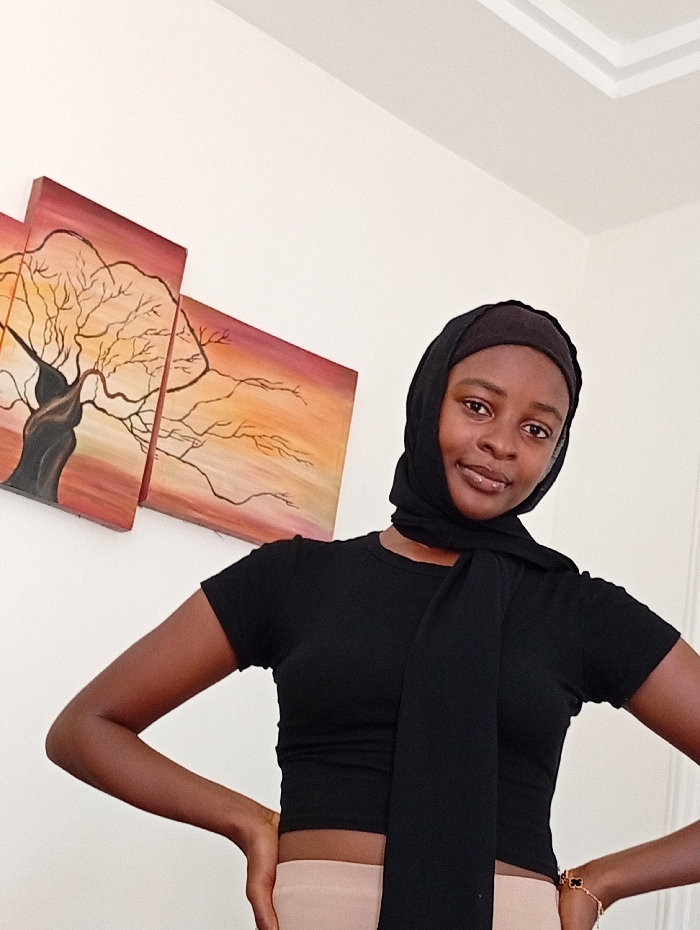 This image depicts a single young adult female in an indoor setting, likely residential or office, within the city of Unknown, Unknown. The subject, of medium-dark complexion, stands centrally, facing the camera with a slight smile. She is dressed in a black short-sleeved top, a black hijab covering her head and left side, and light beige lower garments. Both hands are placed on her hips. A gold-toned bracelet with a black four-leaf clover design adorns her right wrist. The background features a plain white wall. Two horizontal canvas paintings are mounted on the wall to her left, showcasing a dark, bare-branched tree against a red, orange, and yellow gradient sky. A white ceiling with a simple rectangular recessed detail is visible at the top of the frame.