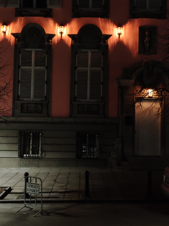 The image depicts a nighttime exterior view of a multi-story building facade and an adjacent sidewalk in Sofia, Bulgaria