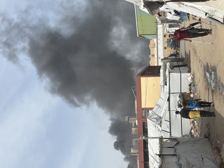 This outdoor scene, set in Gaza, Palestinian Territory, features a large, dark grey to black smoke plume dominating the upper right sky, originating from structures in the background