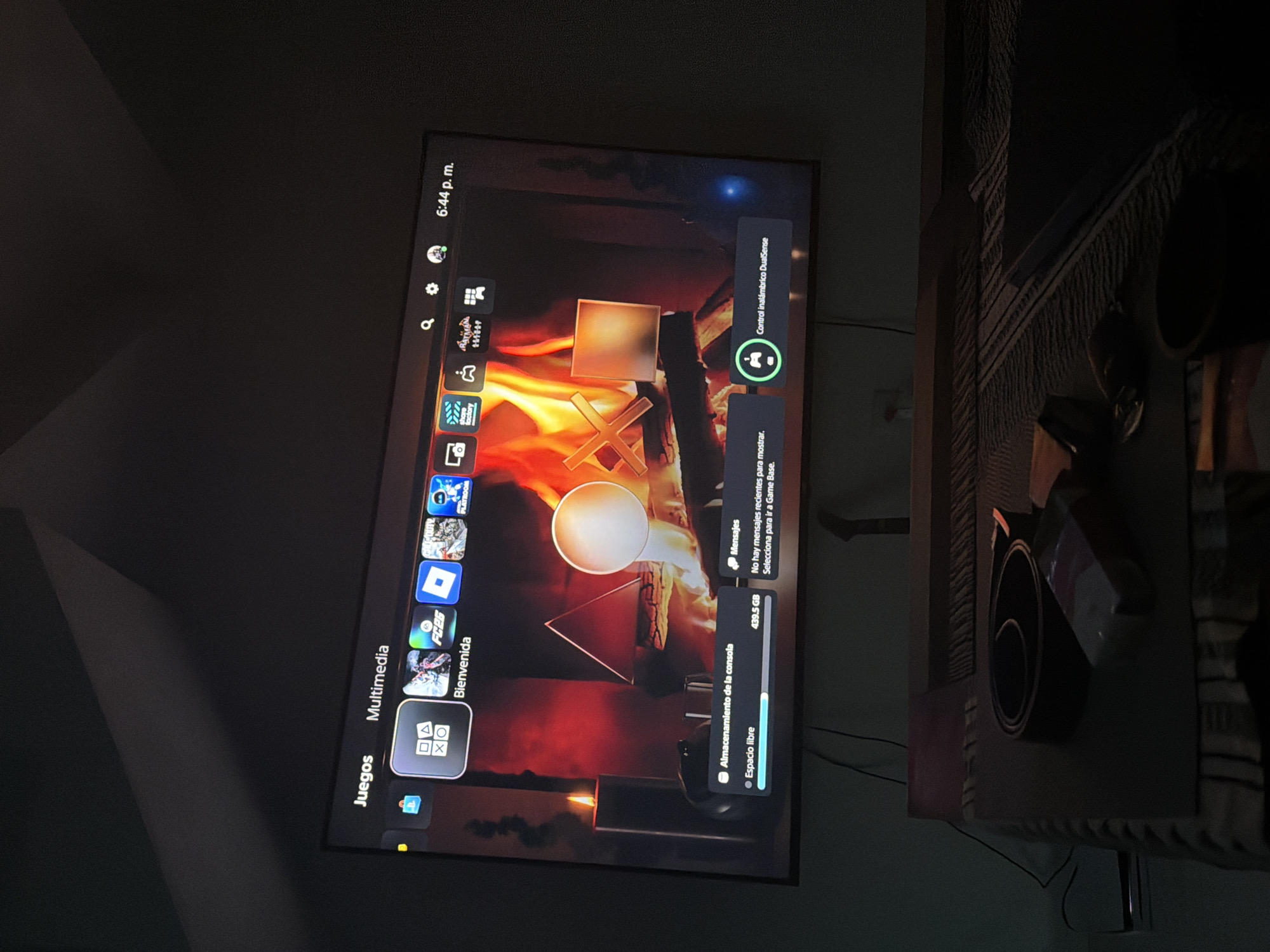 television screen displaying the main menu of a PlayStation console. The screen displays the options "Juegos" (Games) and "Multimedia" on the left, along with various game icons. On the right, there's information about storage, messages, and the connected DualSense controller. The time "6:44 p.m." is visible in the upper right. The background of the PlayStation menu features a dynamic visual of a fireplace scene. The television is mounted on a wall, and next to it is a piece of furniture with objects on it, including what appears to be a speaker. The environment appears to be a dim room in a home. The location is not determinable from the image, though the language displayed on the television is Spanish.