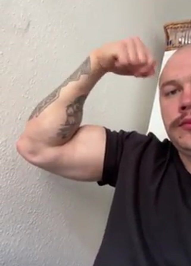 A short video shows a man flexing his right arm. The man is light-skinned with a bald head and a mustache. He wears a black t-shirt. He holds his right arm up, bent at the elbow, and flexes his bicep, making a fist with his hand. The arm has a tattoo in black ink that extends from the shoulder to the elbow. The background is a light-colored wall with a textured surface. A portion of a white object is visible on the right side of the frame. A small wicker basket is also partially visible in the top right corner.