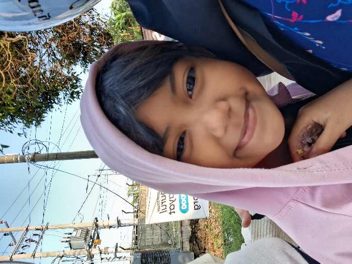 A young girl, estimated to be between 5-10 years old, with dark hair and a fair complexion, smiles directly at the camera. She wears a light pink hooded sweatshirt with the hood drawn over her head. Her right hand, located centrally in the lower frame, holds a small, clear, irregularly shaped object containing golden flakes. To the girl's immediate left, the shoulder and arm of an individual wearing a white, possibly knitted, garment are partially visible. To her right, the shoulder area of a person wearing a dark blue garment with a red floral pattern is visible, along with a brown strap, likely from a bag or a helmet, and the top portion of a white motorcycle helmet with a dark visor. The scene is an outdoor environment in Ngampelsari, Indonesia, under a clear blue sky. The background on the left features a substantial utility pole equipped with multiple transformers and an intricate network of power lines. Below this structure, a concrete barrier or fence line is visible. Further back, a white banner with blue, inverted text, partially legible as "LUNAS" and "Toyota," is displayed. The background on the right includes another tall utility pole wrapped with numerous cables. Green foliage and trees, including identifiable banana trees, are visible in the mid-ground and extending into the upper right corner of the frame. The ground appears to be a mix of dirt and sparse vegetation, characteristic of a roadside or utility easement.