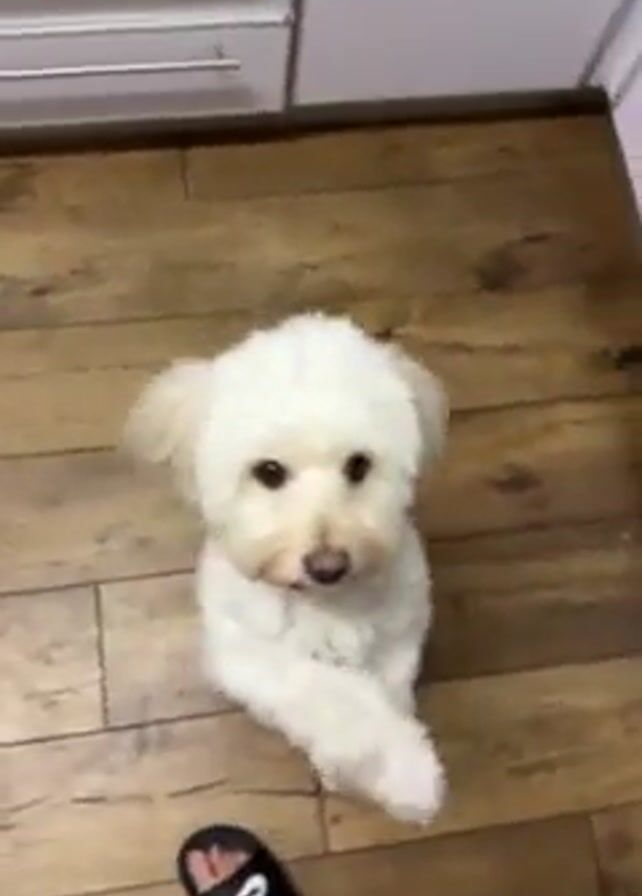 small, fluffy, white dog standing on its hind legs on a wooden floor in what appears to be a kitchen
