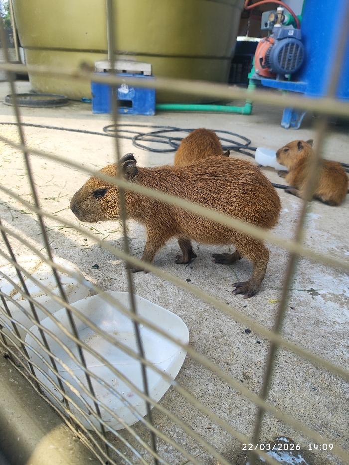 The image captures an outdoor scene at 14:09 on March 22, 2026, in Tocuyito, Venezuela, viewed through a grey wire mesh fence. The primary subjects are three juvenile capybaras situated on a light grey concrete surface. In the left-center foreground, a larger, reddish-brown capybara stands, facing left, with visible webbed toes. A second capybara, also reddish-brown, is partially obscured directly behind the first. In the mid-ground right, a third, smaller capybara lies prone, feeding from a small white plastic bottle. The concrete ground exhibits scattered dry plant material and isolated wet patches. A white plastic rectangular trough or container is positioned in the lower-left foreground, inside the enclosure. The background contains a large, olive-green cylindrical tank on the left, resting on a blue plastic crate. To the right, an industrial pump or motor unit, predominantly blue and orange, is visible with green tubing connections. Several black electrical cables are coiled on the concrete between the animals and the background structures.