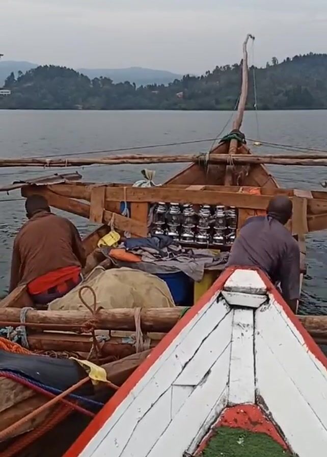 Two men are rowing a wooden boat on a body of water. The boat is carrying a load that includes a crate of what appears to be metal tins. A second boat, partially in view, is ahead of them. The water is choppy and the sky is overcast. In the distance, a hilly, tree-covered landscape is visible.