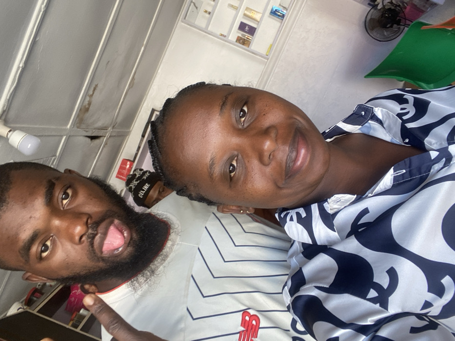 A selfie shows three individuals indoors. A bearded man with dark skin is in the lower left with his tongue out and a peace sign. Next to him is a woman with dark skin and braided hair, wearing a blue and white patterned shirt. A third person with a black “CELINE” hat is in the background between the man and woman. A display cabinet, a fan, and a green chair are visible in the background. The lighting is bright.