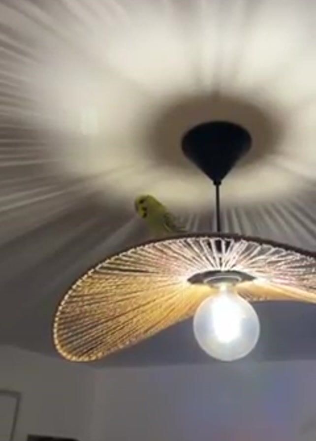 A low-angle shot shows a light green budgerigar perched on a lampshade. The lampshade is made of tan woven material. A lightbulb in the lampshade casts rays across the ceiling. The bird looks around. It suddenly flies directly upward out of the frame.