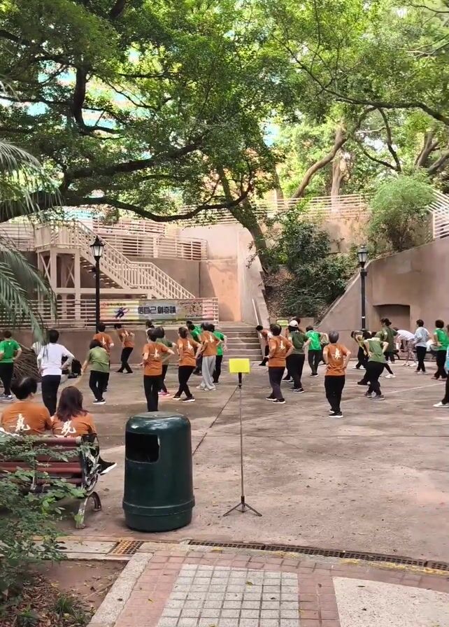 A group of adults exercise in a park. The group is comprised of approximately 20 people, most of whom are dressed in bright colored shirts of green, orange, or blue. They perform synchronized exercises in a wide paved space beneath a large tree, following directions from a pole-mounted speaker. Behind the exercise group is a low brick wall with wooden stairs leading up to it. A small group of individuals is sitting on a bench watching the group exercise. A metal trash bin is near the bench. A checkered pattern is visible on the paving stones in the foreground. The light is diffused and the leaves of the tree overhead provide shade.