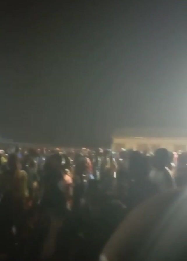 blurry view of a crowd of people at night. Bright lights shine into the camera, making it difficult to discern details. Tents can be seen in the background, suggesting an outdoor event or festival. The people appear to be moving and possibly dancing. The overall impression is a lively and energetic atmosphere, despite the low visibility.