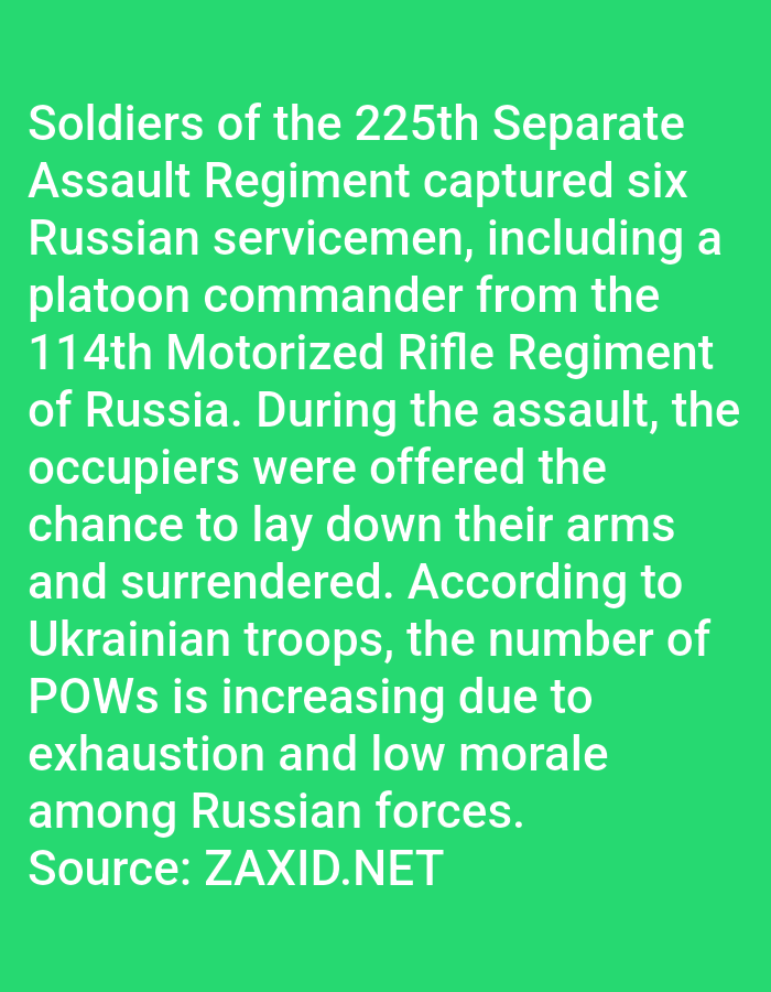The 225th Separate Assault Regiment captured six Russian servicemen, including a platoon commander from Russia's 114th Motorized Rifle Regiment. During the assault, the "occupiers" were offered the chance to surrender, which they accepted. Ukrainian troops report that the number of POWs is increasing due to exhaustion and low morale among Russian forces. The source is ZAXID.NET.