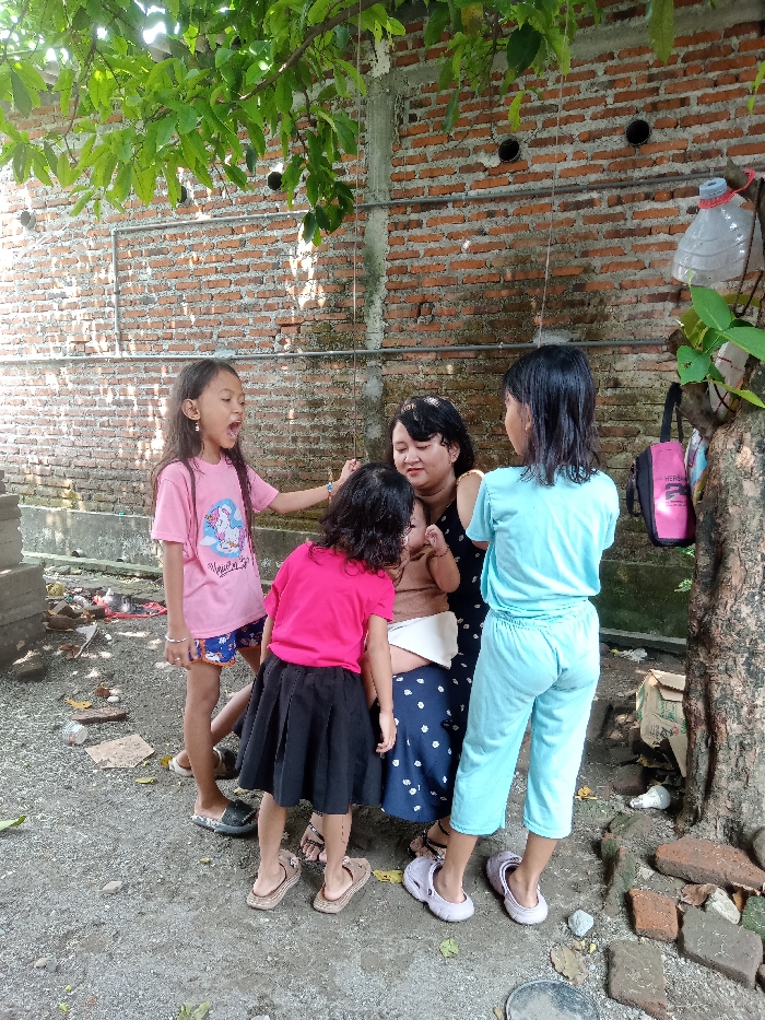 The image depicts an outdoor gathering in the city of Baron, Indonesia. Five individuals are present: one adult female and four children. An adult woman with dark, shoulder-length hair, wearing a dark blue polka-dot dress, is positioned centrally, holding a baby against her front. The baby is partially visible, wearing a light-colored lower garment. The woman looks down towards the children. To her left, a girl with long dark hair, wearing a pink t-shirt with a unicorn graphic and blue patterned shorts, stands with her mouth open and left arm extended towards the adult. In the immediate foreground, a younger girl with dark, curly hair, dressed in a pink t-shirt and black pleated skirt, stands facing the adult and baby. To the adult's right, a girl with straight dark hair, wearing a light blue t-shirt and light blue capri pants, stands with her back partially to the viewer, also oriented towards the adult and baby. The environment consists of a dirt and gravel ground with scattered debris, including small pieces of concrete and paper. In the background, a weathered red brick wall with visible mortar lines features three distinct circular holes and a horizontal metal pipe. Overhead, green leaves from a tree branch extend into the frame, casting shadows. On the right side, a tree trunk supports a pink bag labeled "HERBALIFE" and an inverted clear plastic bottle hanging from its branches. Stacked concrete blocks are visible on the ground to the far left. The scene is illuminated by bright daylight.