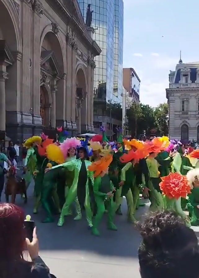 street performance or parade of people dressed as flowers in green suits with large, colorful flower heads. They are performing synchronized movements, possibly dancing, in a paved area. Behind them are buildings, including a large stone church and a modern high-rise building. Other people, presumably spectators, are watching and recording the performance with their phones. The weather appears sunny, and the overall atmosphere is festive.