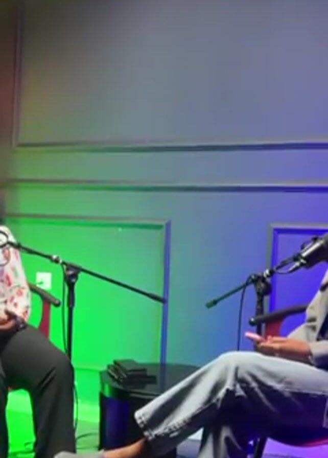 Two people are seated in chairs in a studio, facing each other and seemingly engaged in conversation