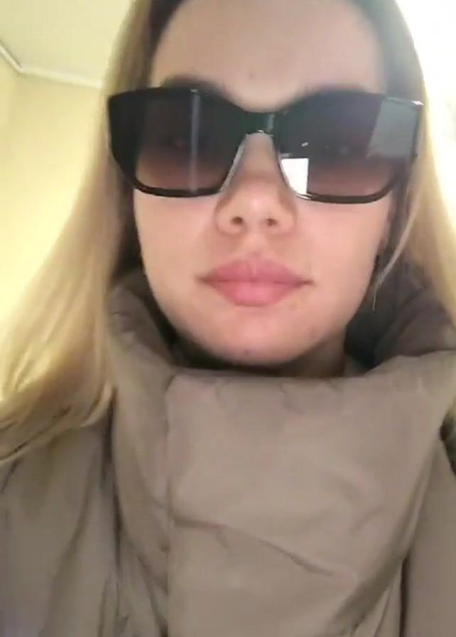 A woman wearing sunglasses and a puffy scarf stands indoors, then rapidly moves outdoors, remaining upright in both locations. The transition is achieved in a split second, giving the impression of teleportation. She is in front of a building, the sky is blue.